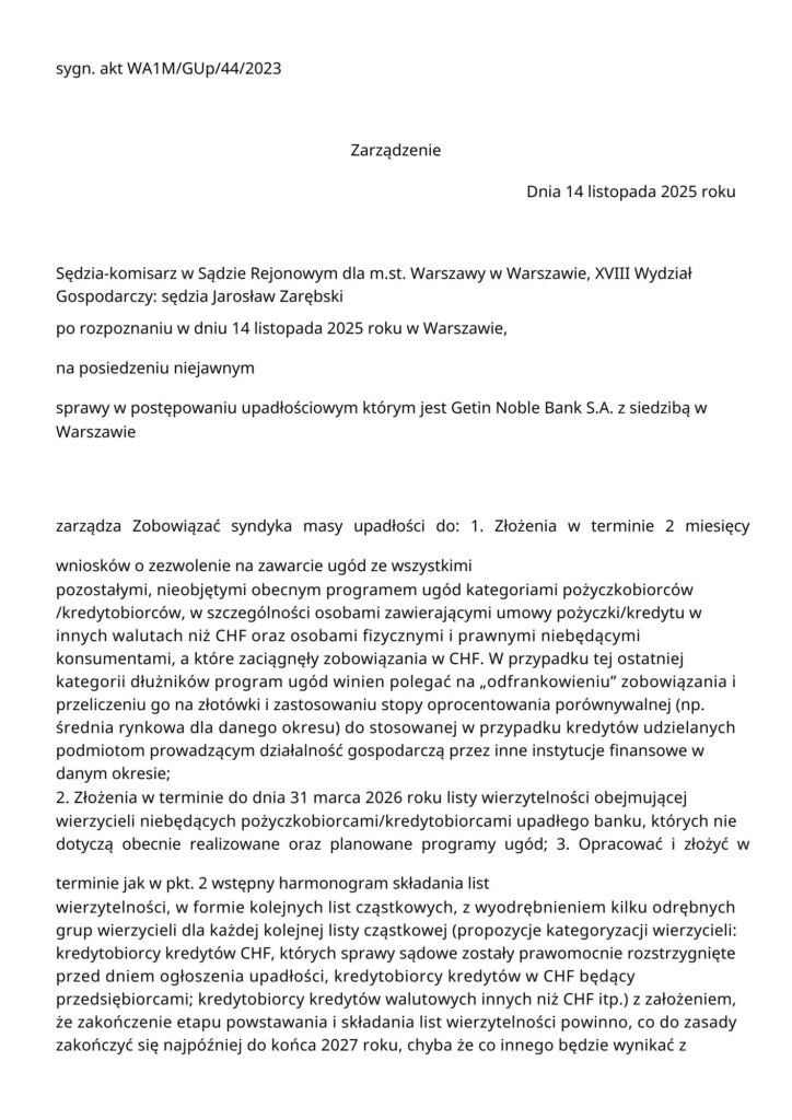Decyzja sędziego-komisarza może zostać odebrana jako impuls do uporządkowania procesów toczących się z udziałem frankowiczów. W sytuacji, w której jedna strona – konsument – pozostaje w sporze z ogromną instytucją, kluczowe jest zapewnienie transparentności, której brak był szczególnie dotkliwy w sprawach przeciwko Getin Noble Banku. W zarządzeniu pojawia się także nakaz „opracowania i złożenia harmonogramu składania list wierzytelności”, co pozwoli wreszcie na uporządkowanie spraw, które od dłuższego czasu znajdowały się w stanie zawieszenia. To krok w kierunku, którego oczekiwali wszyscy wierzyciele, w tym frankowicze.