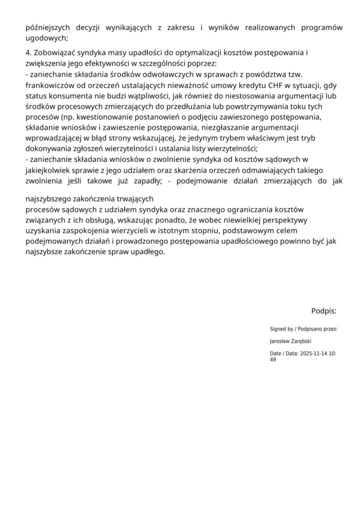 W zarządzeniu czytamy, że „podstawowym celem podejmowanych działań i prowadzonego postępowania upadłościowego powinno być jak najszybsze zakończenie spraw upadłego”. Ten fragment uderza w sedno konfliktu między syndykiem a pokrzywdzonymi konsumentami. Dotychczas frankowicze wielokrotnie zgłaszali, że działania syndyka Kubiczka prowadzą do rozbudowywania kosztów, a nie do ich ograniczania, co osłabiało ich pozycję jako wierzycieli. Sąd po raz pierwszy tak wyraźnie wskazał, że interes konsumentów powinien być nadrzędny w całym procesie.