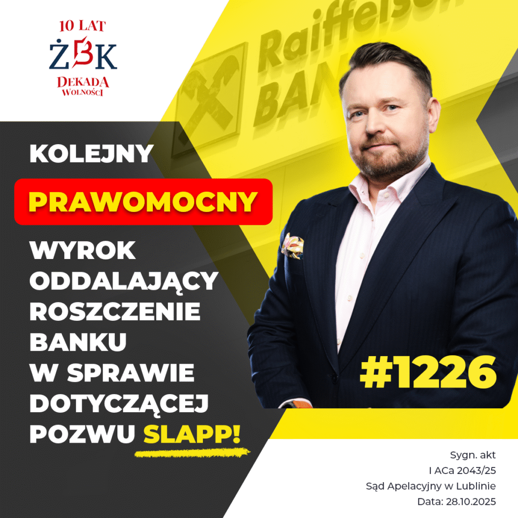 Sąd oddalił powództwo banku w całości, obejmujące kwotę 393 634,92 PLN, a także zasądził na rzecz kredytobiorcy zwrot kosztów procesu – 10 817,00 PLN za pierwszą instancję i 9 100,00 PLN za apelację – wraz z ustawowymi odsetkami. To kolejny prawomocny wynik w sprawach członków ŻBK i jasny sygnał, że sądy nie ulegają narracji banków, próbujących wykorzystywać SLAPP do zniechęcania kredytobiorców do obrony swoich praw.