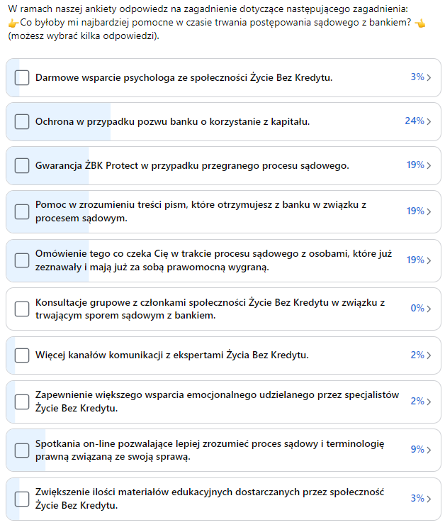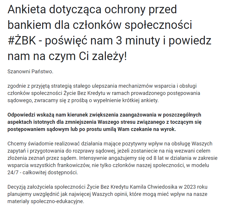 Decyzją założyciela społeczności Życie Bez Kredytu Kamila Chwiedosika w 2023 roku planujemy uwzględnić jak najwięcej Waszych opinii, które mogą mieć wpływ na nasze materiały społeczno-edukacyjne. Wdrożone przez nas do tej pory działania pozwoliły uspokoić dziesiątki tysięcy frankowiczów, ale jest ich setki tysięcy. Dlatego w realizację naszej misji wkładamy wiele wysiłku, stawiając na pierwszym miejscu opinię i potrzeby kredytobiorców, którzy pozwali z nami swój bank, ale też tych, którzy obawiają się pozwu ze strony banku lub nawet zostali już pozwani.