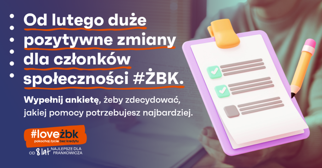 Zależy nam na wybraniu obszarów i konkretnych działań, które będą ważne przede wszystkim dla osób, które są już obsługiwane sądowo w ramach zespołów naszych ekspertów prawa finansowego i ekonomii. W związku z powyższym zwracamy się z serdeczną prośbą o podzielenie się z nami doświadczeniami, opiniami i swoim potrzebami, które będziemy stawiali na pierwszym miejscu przy opracowaniu strategii wsparcia na najbliższe lata. Badanie, do którego zapraszamy, jest całkowicie anonimowe, a zebrane dane będą analizowane statystycznie i zostaną zaimplementowane zgodnie z oczekiwaniami większości z Was. Link do ankiety znajdziecie tutaj: Ankieta dotycząca ochrony przed bankiem dla członków społeczności #ŻBK – poświęć nam 3 minuty i powiedz nam na czym Ci zależy!