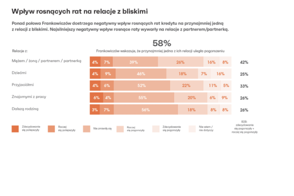 I ponad połowa Frankowiczów dostrzegła ten negatywny wpływ rosnących rat kredytu na relację z bliskimi. Autor książki, analizując te badania, podkreśla, że kredyt, który zaciągamy z drugą połówką, niezwykle mocno przekłada się na nasze relacje. Cztery na dziesięć badanych osób przyznały, że ich relacje z małżonkiem czy partnerem popsuły się właśnie przez rosnące zobowiązanie wobec banku. To bardzo dużo zniszczonych, trudnych do odbudowania więzi. Relacje psują się z różnych powodów, ale jeżeli jeden czynnik – coraz wyższe raty kredytu – spowodował ich pogorszenie aż u czterech na dziesięć osób, jest to zdecydowanie alarmujące.
