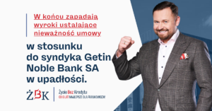 Nie możesz przeczytać? Skorzystaj z odtwarzacza i posłuchaj! Getting your Trinity Audio player ready… Ustalenie nieważności kredytu Getin w stosunku do syndyka. Mamy pierwszy wyrok! Kolejny sukces społeczności ŻBK! 27 października Sąd Okręgowy w Warszawie wydał wyrok unieważniający kredyt CHF zawarty w upadłym Getin Banku. Powództwo toczyło się z udziałem syndyka masy upadłościowej i przeciwko … Czytaj dalej W końcu zapadają wyroki ustalające nieważność umowy w stosunku do syndyka Getin Noble Bank SA w upadłości.