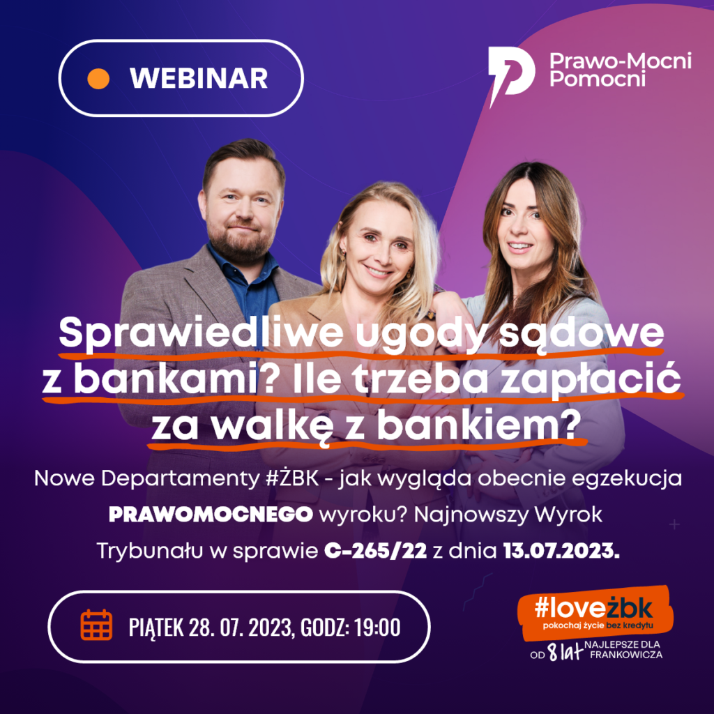 Aby pomóc frankowiczom zrozumieć wszystkie ostatnie zmiany prawne, które wpływają na ich sytuację w relacji z bankiem, organizujemy bezpłatny webinar z naszymi ekspertami ds. frankowych. Webinar odbędzie się 28 lipca 2023 r. o godzinie 19:00. Tematy, które m.in. poruszymy, to: